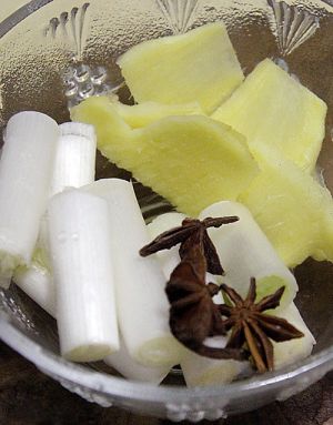 加入大葱、姜片、八角炒出香味,再加入氽过水的肉小火翻炒均匀。