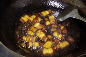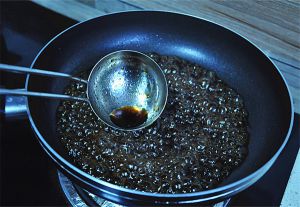 锅内放油,放入冰糖块小火炒化,变成深褐色。