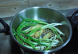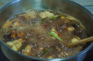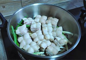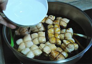大火烧开捞去葱段,加入红枣、莲子等,转至小火继续焖一小时