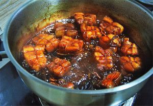 舀适量糖色、生抽、老抽调好浇入每一块猪肉