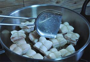 锅中放油,油六成热时,放入五花肉炸,肉皮朝下,炸至金黄时捞出,切麻将大小的块,
