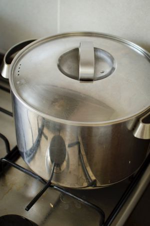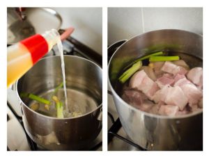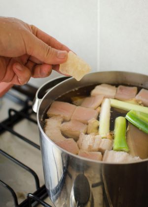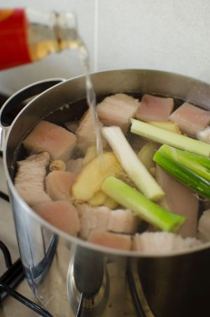 换一锅凉水,再次加入葱、姜、料酒。开大火。