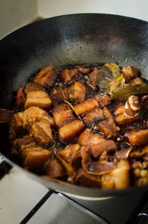 又炖了一个小时后,将肉和汤汁(用量略略没过肉就好)转移到另外一个锅里。颜色不够,又加了些老抽。