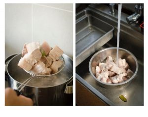 五花肉切方块,热锅凉油放糖炒糖要小火哦见起泡下肉(我做不焯水这样做肉中的油会出去很多)