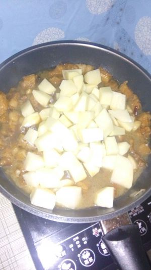 加入土豆炒3分钟,加水小火炖20分钟,加适量盐
