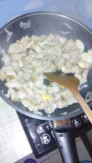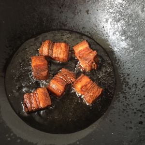 五花肉切成小方块,冷锅下入,不用另加油,炒2分钟