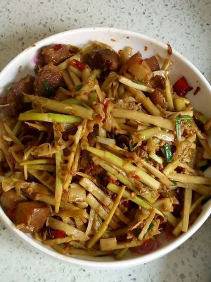 热锅中放入油,炒一下豆瓣酱,加入焯好的山笋,不断的翻炒,上色,均匀后,加入做好的红烧肉,继续翻炒,差不多快熟了,加米酒憋一下,再加入辣椒粉,盐,葱。出锅即可。