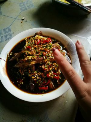最后放入碗中加入蒜泥,切细的香菜,醋,花椒油,盐,味精,拌匀即可