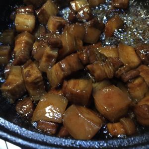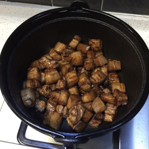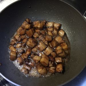 煸炒至冰糖融化,五花肉发黄时加入2汤匙料酒。
