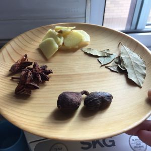 (炒锅入少许油,加白糖炒到鸡血红色时候快速加水或鲜汤)。也可以先锅入油,入葱姜块炒香,再加香料,调盐,鸡粉,酱油。