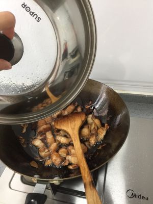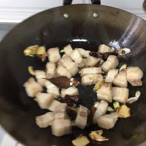 热锅将油烧热后,加入葱、姜煸炒出香味后,倒入五花肉,分别加入5g料酒、生抽、老抽、冰糖翻炒至肉上糖色