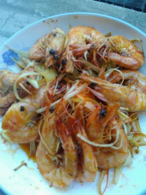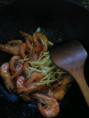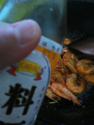 爆炒出香味放入炸好的虾,接着放入料酒,酱油,蚝油,盐少许(可根据自己口味调),继续爆炒片刻即可