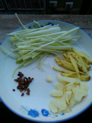葱,姜,切丝。蒜切片,花椒,辣椒一把,梦吃辣的多放点随自己。我没准备辣椒儿子嗓子发炎,没放辣的,