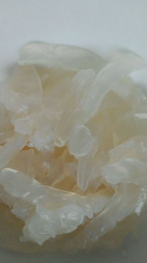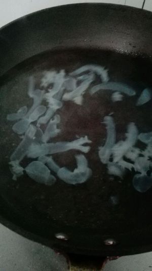 锅中水温七十度左右放入海蜇头,几秒钟后捞出,速度要快,因为海蜇头会快速变小,我甚至还来不及拍照就已经快捞完了。捞出后放入凉水中泡一会再捞出