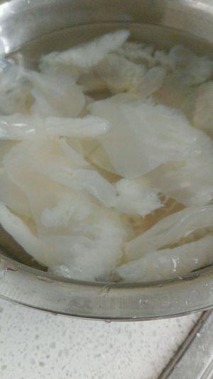 买回来的海蜇头清洗干净后用清水泡着,隔一个多小时换一次水,我总共换了四次水
