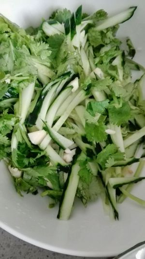 黄瓜切丝,香菜洗净切碎,蒜切碎,一起放入碗中