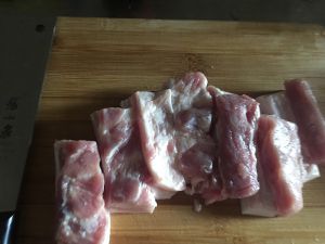 五花肉分肥瘦分好,这次没买到五花肉,买的猪前胛,总之要带肥带瘦的肉。生姜切片,大拇指这么大的生姜片三四片差不多了,葱两三根,长度1寸2寸没考究的,爸爸切的一寸左右。之前没拍图,我找了个差不多的放上来。