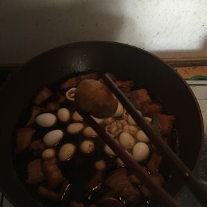 当达到文火时间,大火收汁,肉表面的糖色也开始形成。此时可以品尝一下,盐味是否够,放老抽放下去基本不用放盐。一道美味的红烧肉就完成了!然后准备装盘……