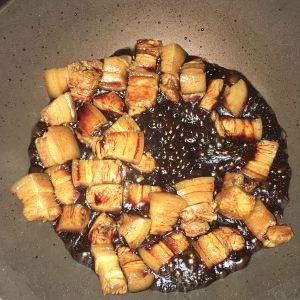 炸出多余油脂后,将油脂沥出。放入准备的生姜片、八角、桂皮、冰糖、放入温开水没过肉,倒入适量的老抽。中火将其烧开……
