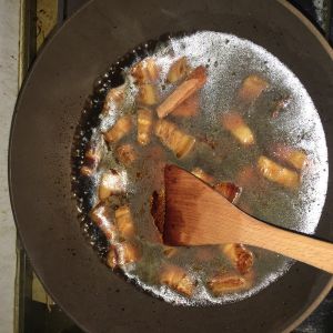 锅中火将肉中水炒干,小火将肥肉中的多余油脂炸出。(注意火候不宜太大,不然肉会焦掉)