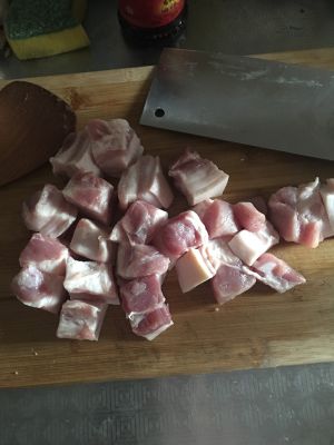 选优质五花肉,温水洗干净……去除多余的肥肉和板油、肉经等,准备切方块!