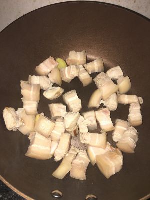 锅里放少量油,放入五花肉煸炒出油,然后加入生姜片和葱煸香