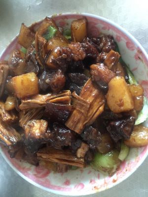 因为考虑到红烧肉热量太高,又加入了土豆、腐竹、青菜。青菜用开水烫好摆盘,腐竹提前泡好,与土豆一起放入开水中煮,并加盐。将红烧肉(带汤汁)、腐竹、土豆放入炒锅中翻炒。如果红烧肉中汤汁不多也可以考虑加水大火收汁。