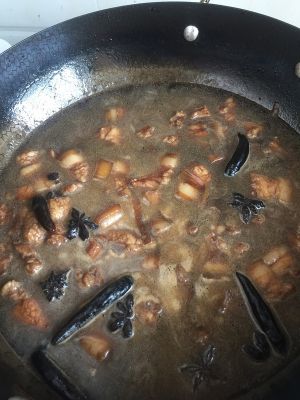 待冰糖全化开,成褐色,倒入肉块,翻炒。