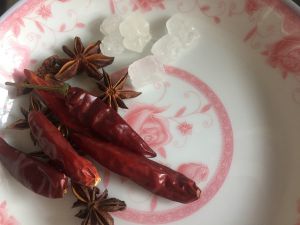 准备热锅冷油,开火,将辣椒、大料、冰糖放入油中。