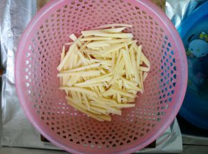先切薄片,再切丝,完后放入菜篮,用水冲一下(做的时候不会粘在一起)