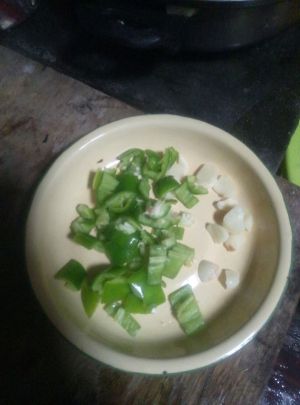 青椒切丁,蒜切丁。