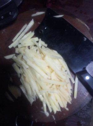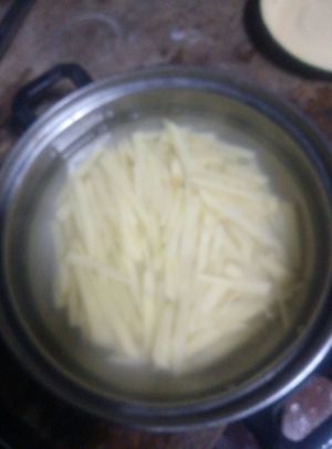 土豆切长条状,切好后用冷水洗两遍,把表面的淀粉洗掉,不然煮的时候容易焦。沥干备用。