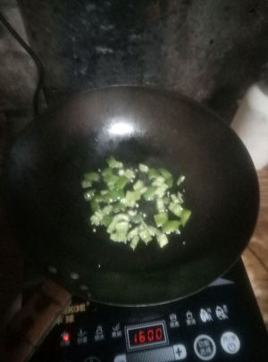 锅热油放入青椒丁,蒜丁,红椒粉炒熟