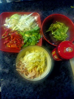 大蒜剁碎,姜切成细丝,最好是选用嫩子姜…蒜苗切长段。