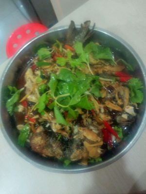 里面有两块排骨是蒸排骨的时候蒸笼放不下了,放鱼里面一起炒了。