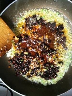 锅热加入猪油,姜、蒜末,葱花,豆豉煸香