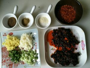 依次加入粗辣椒粉,花椒粉,盐,味精,鸡精,胡椒粉,十三香调味