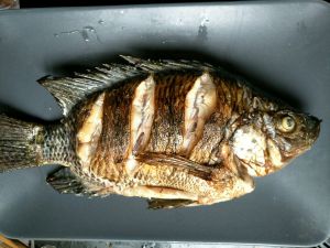 将锅里倒入1kg清油左右,烧至9成热,将淹好的整条鱼放入油锅里,煎到金黄色捞起沥干油,然后将锅里油倒入油盆里,锅里留一大勺油