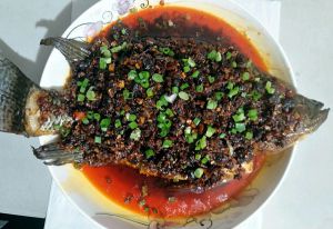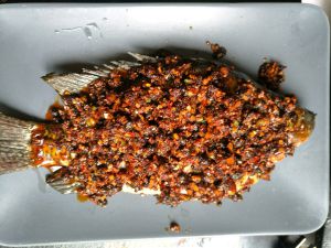 将煸炒好的料均匀铺至鱼上,上锅蒸至15-20分钟,撒上葱花即可