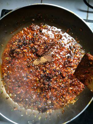 煸炒出香味下入几颗花椒,两勺蚝油,两大勺老干妈豆豉,喜欢吃豆豉的可以多放一些哦,炒出红油,