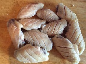 将晾冷的中翅两边均划斜口,为了使其腌制时更入味~