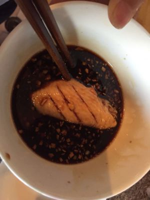 用小碗倒入可以浸泡完所有的鸡翅并且有余的生抽酱油(也要看你用的是什么酱油,因为咸度不一,个人爱好,我用的是海天的),然后根据酱油的咸度放入适当的盐,然后放味精~
