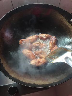 倒入腌制好的鸡翅,煎至两面焦黄。鸡翅膨胀起来,看起来很诱人