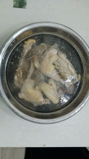锅内冷水,将治净的公鸡剖为两半投入,放生姜、花椒、精盐、料酒适量煮约10分钟,起锅晾凉待用。