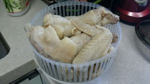 煮熟的鸡腿放入冰水中浸泡,可以让鸡肉口感变脆(冷水中加冰块最好,我是用冰瓶,为了拍照拿出去了)
