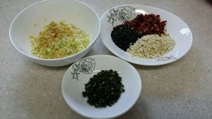 葱姜蒜跺碎,花生炒香捣碎,熟黑芝麻,干辣椒切小块,麻椒少许