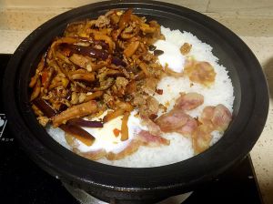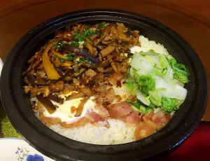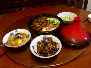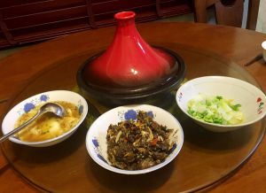 另一个灶就炒鱼香茄子(步骤省略),炒熟后,倒入塔吉锅一起焖。大概十分钟左右关火再焖一会儿就可以出锅吃了。