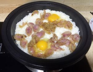 等到水气干后,倒入香肠片,再打两个鸡蛋,盖好锅盖煮。