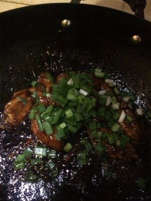 大火收干汤汁后,倒入葱段