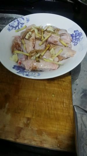 鸡翅淋上酱油撒上姜丝蒜瓣和葱花腌制十分钟